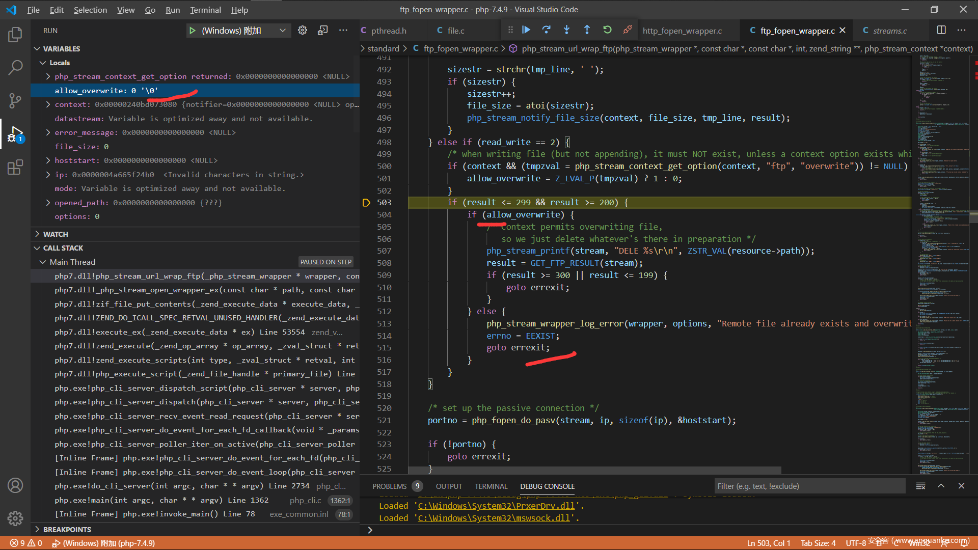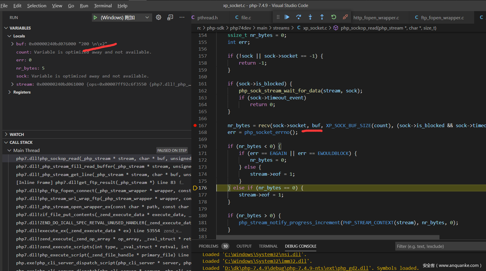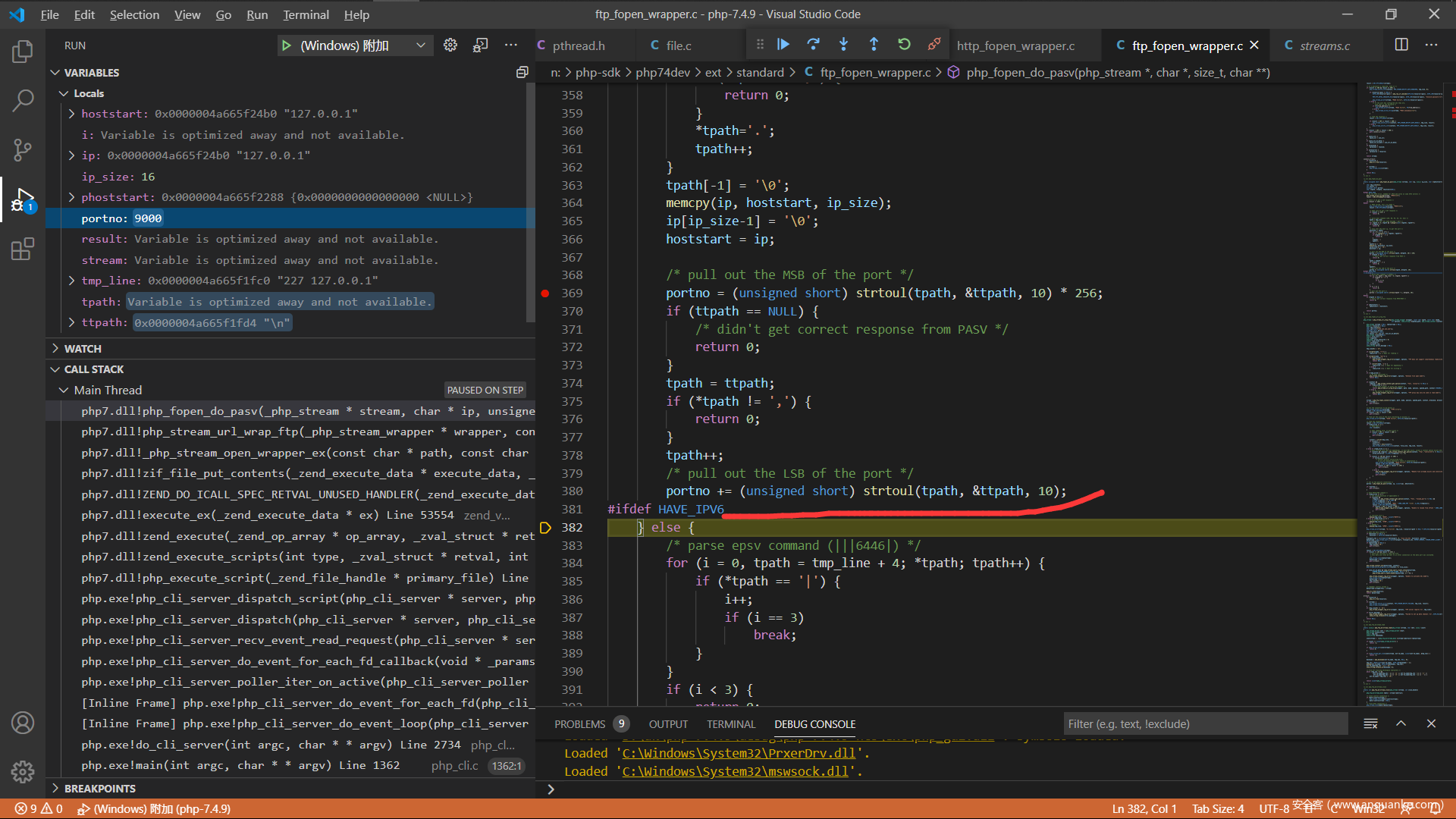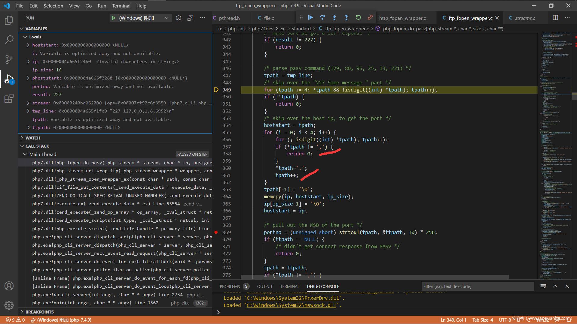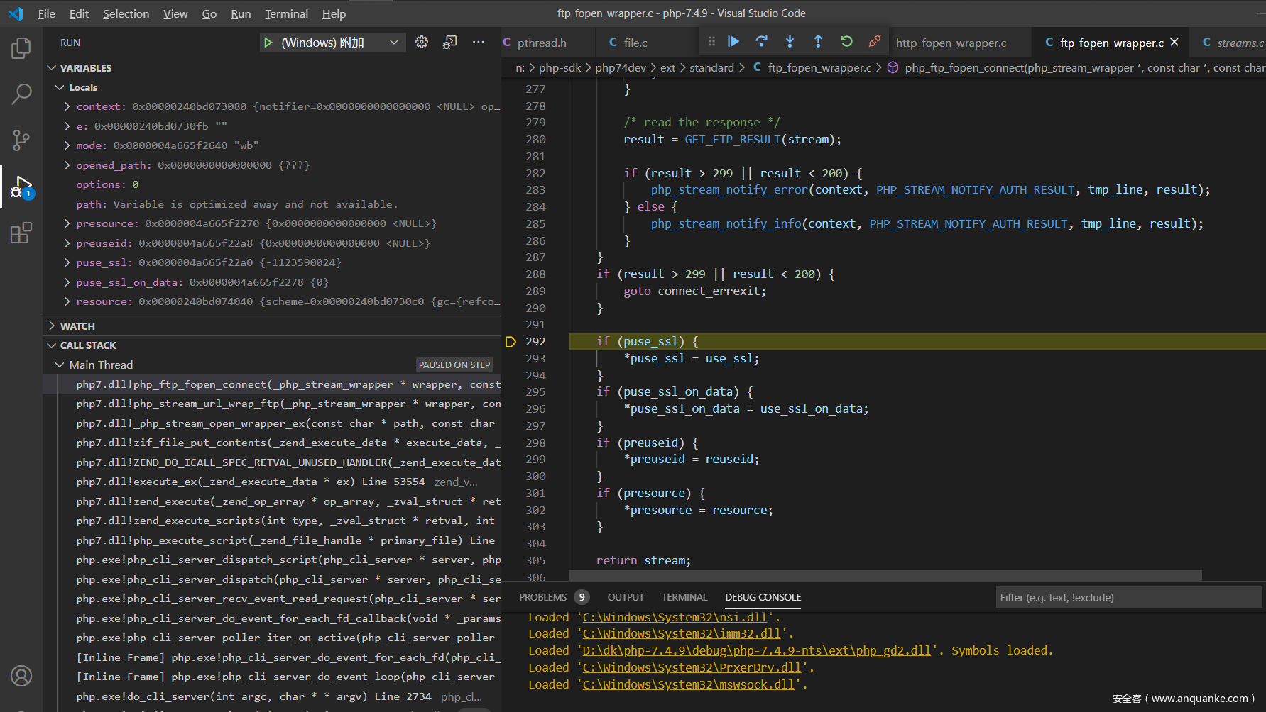 现在来分析一下php的源码吧,调试php的c源码这个应该都没有问题,直接从ftp协议解析的地方开始,我选择的是在window下面附加到php的http服务,下面是index.php的代码