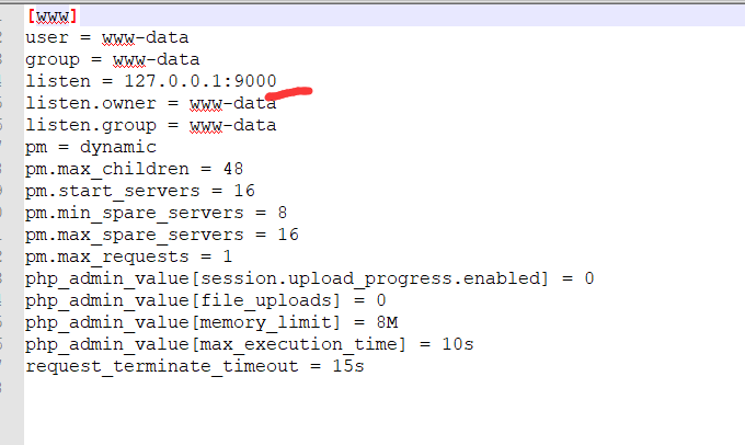 这个题我感觉很有意思,网上没有找到wp,所以来写一下wp,题目给了环境,可以注意到给的www.conf里的fpm是监听的9000端口,也就是和之前遇到的一些fastcgi的攻击有关
