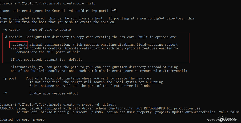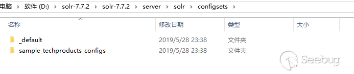 -d 参数是指定配置模板,在solr 7.7.2下,有_default与sample_techproducts_configs两种模板可以使用