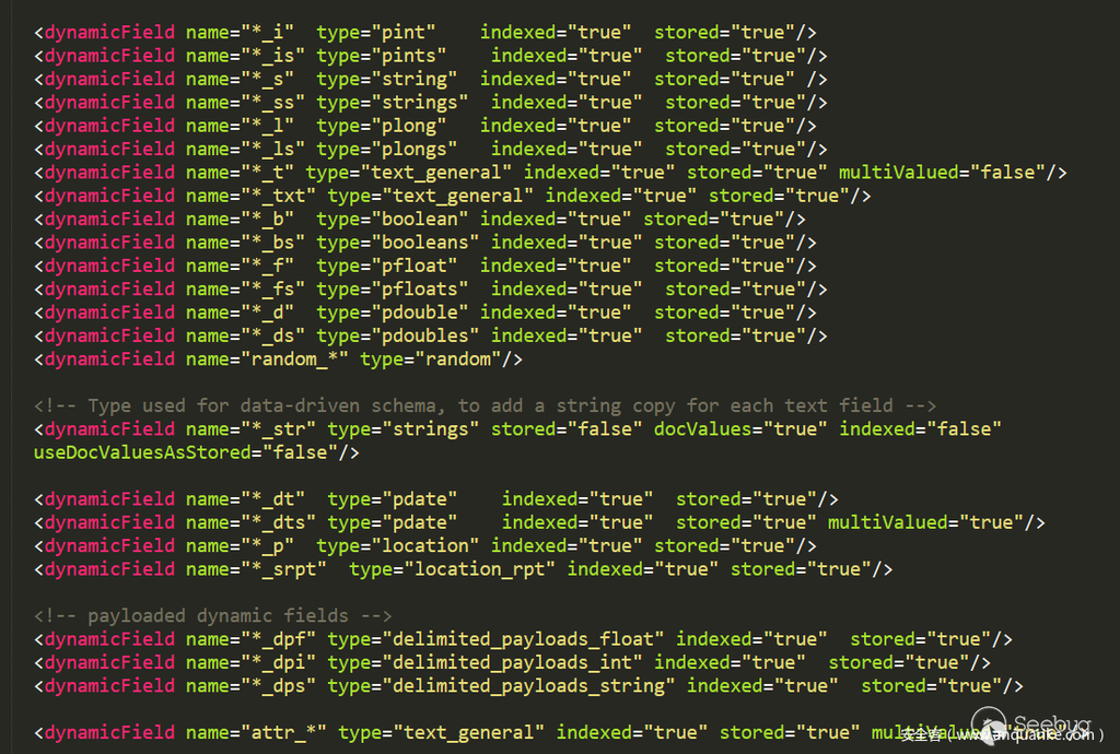 schema.xml/managed-schema:这里面定义了与数据源相关联的字段(Field)以及Solr建立索引时该如何处理Field,它的内容可以自己打开新建的core下的schema.xml/managed-schema看下,内容太长就不贴了,解释下与该漏洞相关的几个元素: