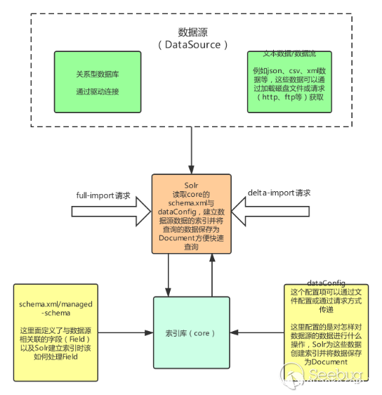 - Core:索引库,其中包含schema.xml/managed-schema,schema.xml是模式文件的传统名称,可以由使用该模式的用户手动编辑,managed-schema是Solr默认使用的模式文件的名称,它支持在运行时动态更改,data-config文件可配置为xml形式或通过请求参数传递(在dataimport开启debug模式时可通过dataConfig参数传递)