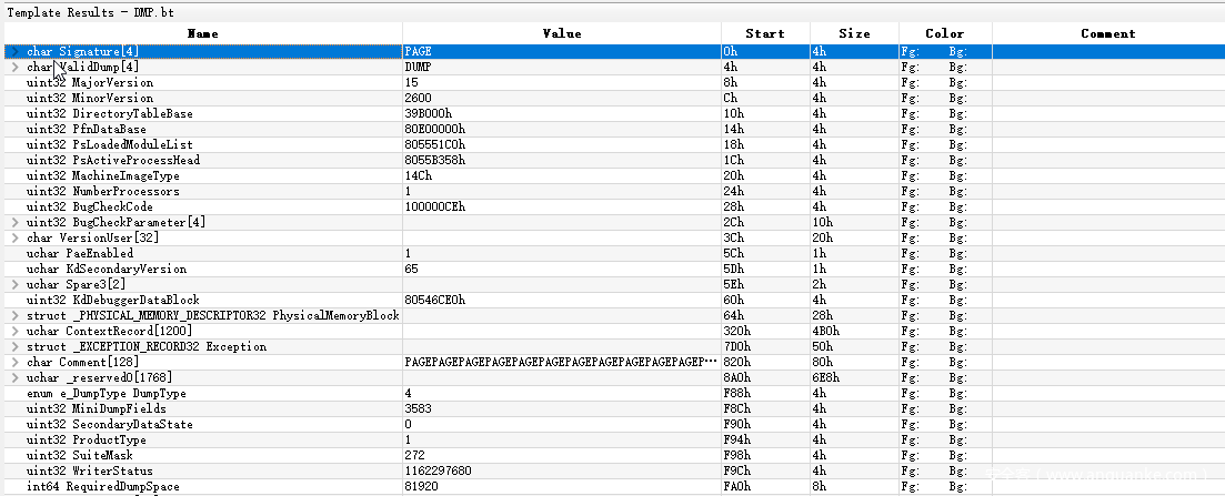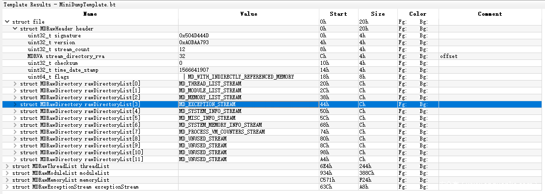 我们也可以用010Editor的MiniDumpTemplate.bt模板来查看,例如查看某应用程序的dmp,运行模板后: