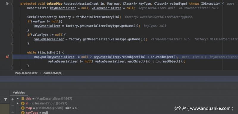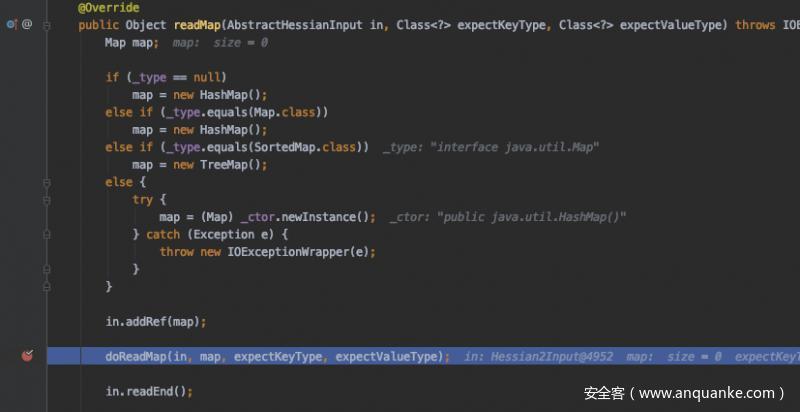 在Hessian2Input对象中的readobject方法中调用了readMap函数