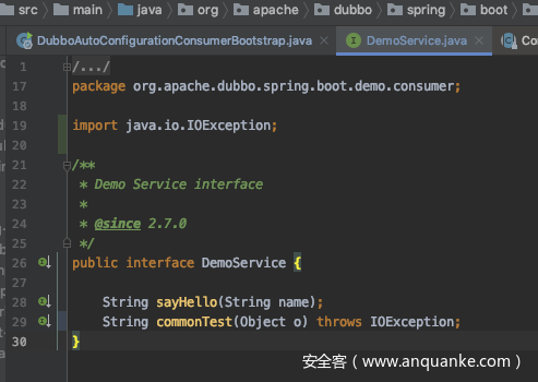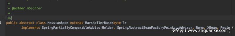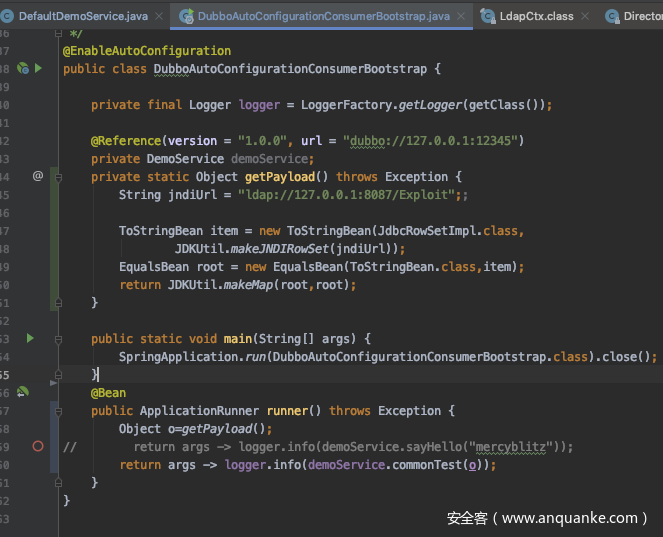 这个是Hessian 序列化之后的数据,想要利用起来还要封装一层Dubbo协议,我们采用dubbo-spring-boot项目中的DubboAutoConfigurationConsumerBootstrap类进行构造。这里注意一点如果使用Dubbo的消费者和提供者协议Dubbo会自动Hessian序列化传输的对象,所以下面构造Payload只需将利用编写好之后调用Dubbo协议调用即可。