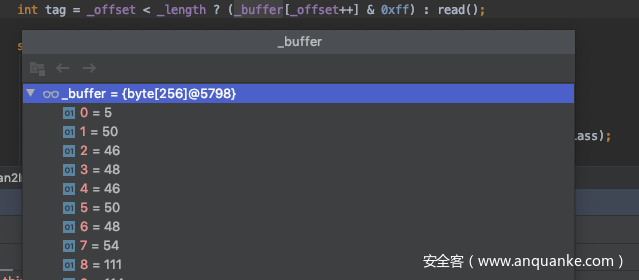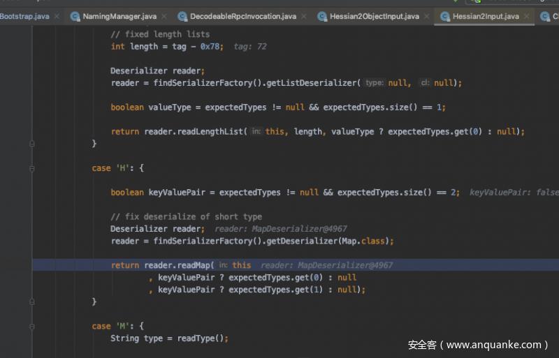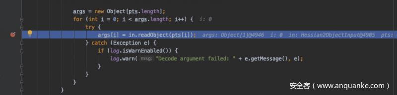 in 现在是Hessian2ObjectInput对象,其中包含了要反序列化的二进制内容