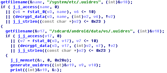 - 访问文件/system/etc/.uuidres或/sdcard/android/data/vs/.uuidres,若该文件存在,则取出字符串。该字符串作为后面POST信息的“ID”;若不存在,则结合随机数、进程ID、日期等生成字符串写入;