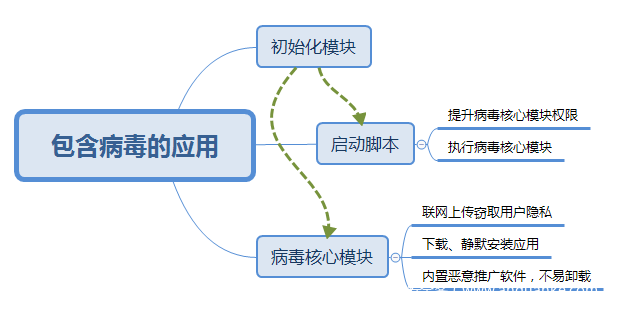 | 病毒核心模块 | 执行联网上传窃取用户隐私和私自安装应用,完成病毒的核心功能。 |