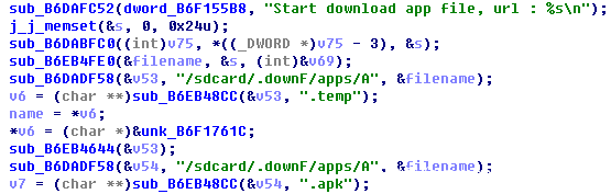 - 安装APK:从云端获取到推广的APK为ZIP包,位于/sdcard/.downF/apps路径下,文件名为“A+随机数.temp”,对其进行解密,生成APK文件;