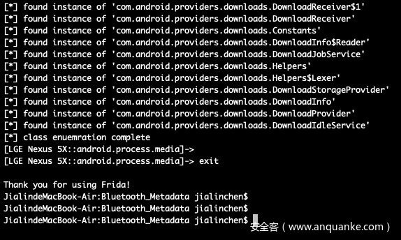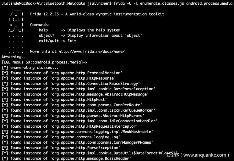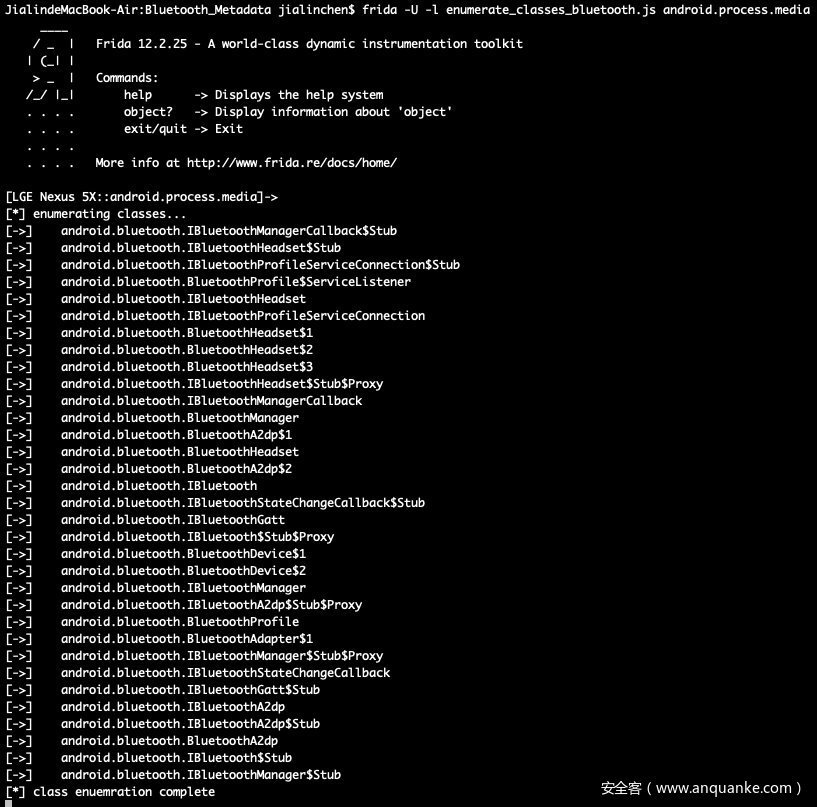 $ frida -U -l enumerate_classes_bluetooth_choose.js com.android.bluetooth