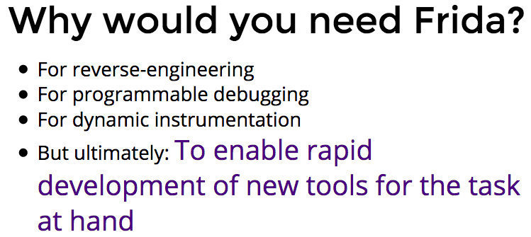 Frida is Greasemonkey for native apps, or, put in more technical terms, it’s a dynamic code instrumentation toolkit. It lets you inject snippets of JavaScript into native apps that run on Windows, Mac, Linux, iOS and Android. Frida is an open source software.