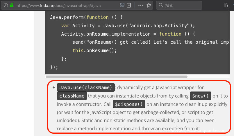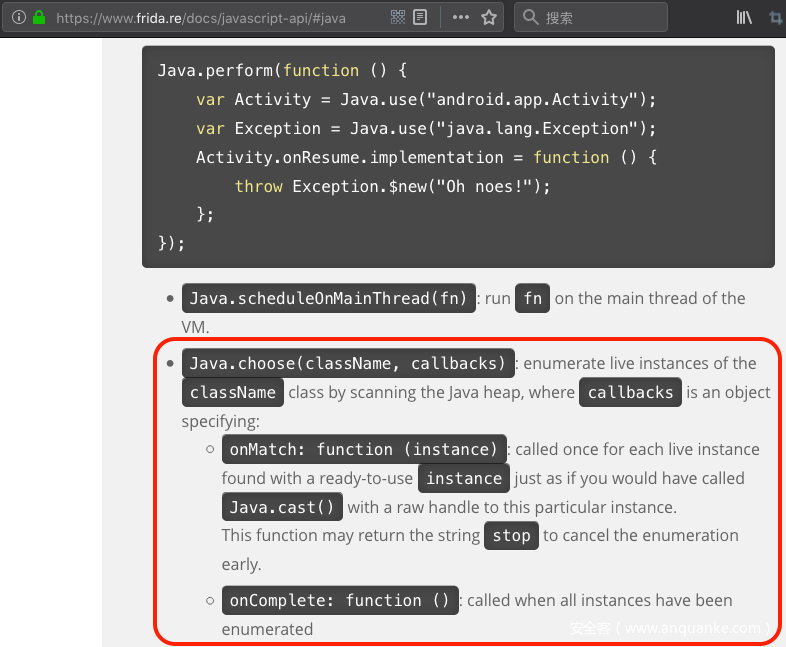 定位到我们想要研究的类之后,就可以打印类的实例了,查看FRIDA的API手册可以得知,此时应该使用Java.choose()函数,来选定某一个实例。