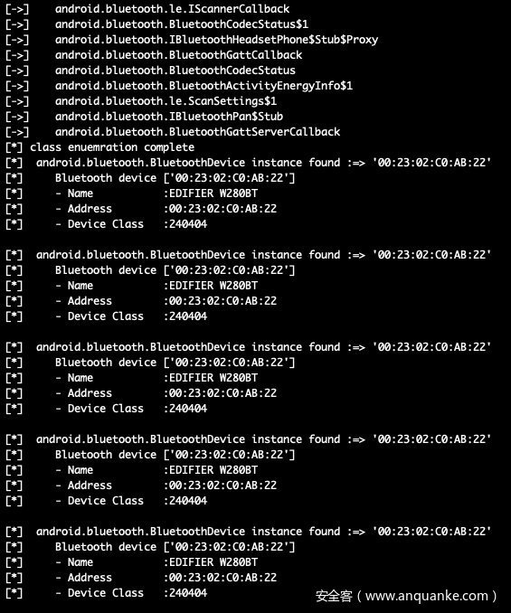 该脚本首先枚举了很多蓝牙相关的类,然后choose了很多类,包括蓝牙接口信息以及蓝牙服务接口对象等,还加载了内存中已经分配好的蓝牙设备对象,也就是上文我们已经演示的信息。我们可以用这个脚本来“查看”App加载了哪些蓝牙的接口,App是否正在查找蓝牙设备、或者是否窃取蓝牙设备信息等。
