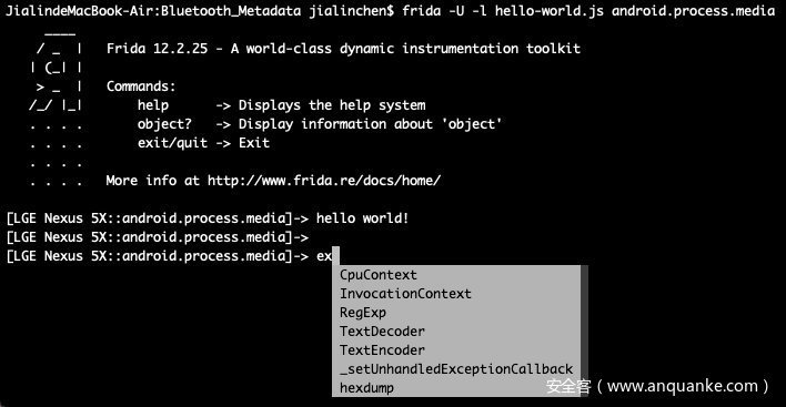 这基本上就是一个FRIDA版本的”Hello World!”,我们把一个匿名函数作为参数传给了setTimeout()函数,然而函数体中的Java.perform()这个函数本身又接受了一个匿名函数作为参数,该匿名函数中最终会调用console.log()函数来打印一个“Hello world!”字符串。我们需要调用setTimeout()方法因为该方法将我们的函数注册到JavaScript运行时中去,然后需要调用Java.perform()方法将函数注册到Frida的Java运行时中去,用来执行函数中的操作,当然这里只是打了一条log。
