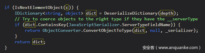 在BasicDeserialize内部又调用了DeserializeInternal方法,当需要转换为对象的时候会判断字典集合中是否包含了ServerTypeFieldName常量的Key,