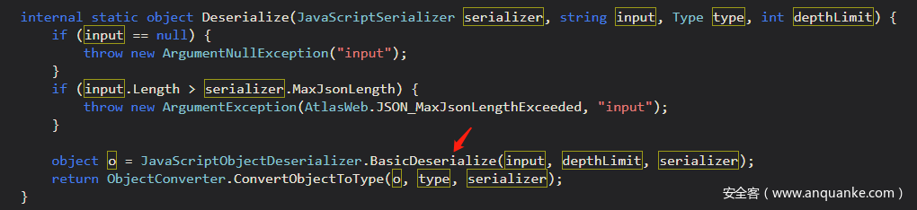 DeserializeObject方法只是在Deserialize方法上做了一层功能封装,重点来看Deserialize方法,代码中通过JavaScriptObjectDeserializer.BasicDeserialize方法返回object对象