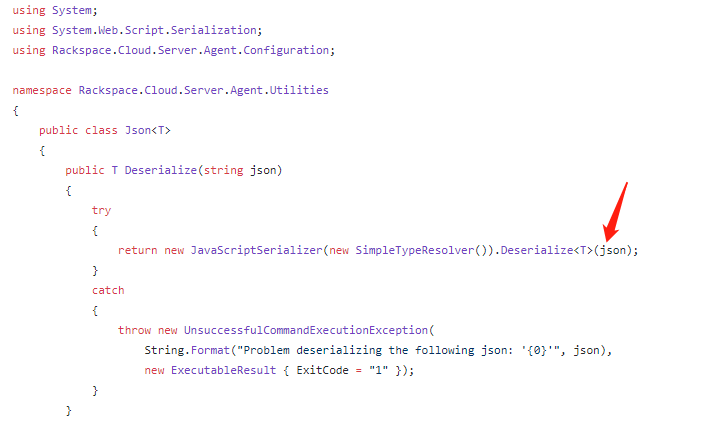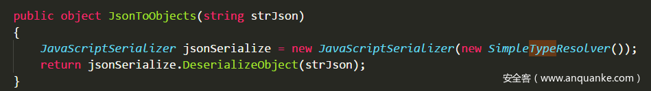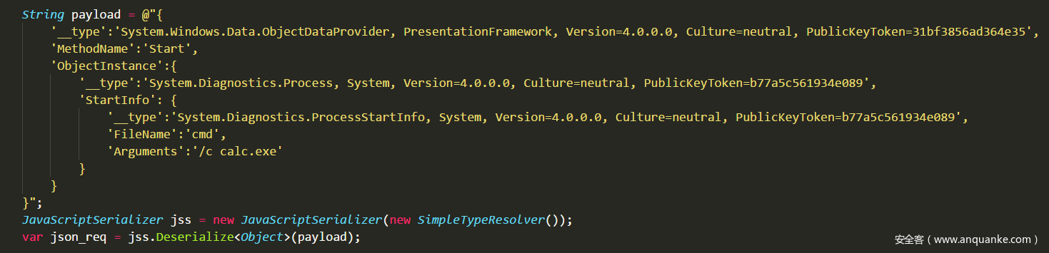 从之前介绍过其它组件反序列化漏洞原理得知需要 __type这个Key的值,要得到这个Value就必须得到程序集全标识(包括程序集名称、版本、语言文化和公钥),那么在JavaScriptSerializer中可以通过实例化SimpleTypeResolver类,作用是为托管类型提供类型解析器,可在序列化字符串中自定义类型的元数据程序集限定名称。笔者将代码改写添加类型解析器