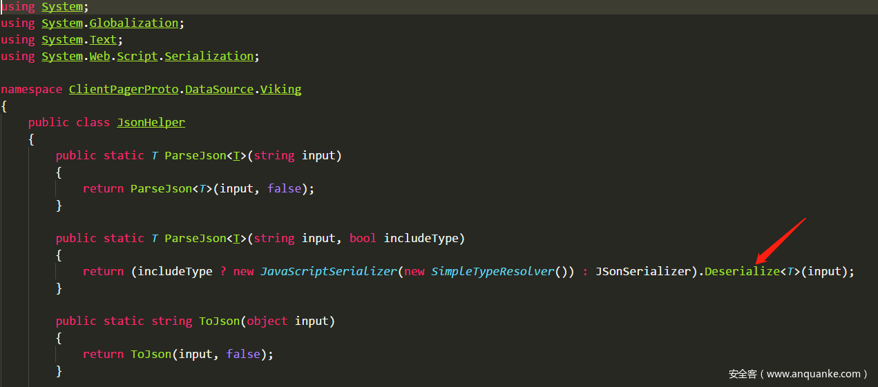 从代码审计的角度其实很容易找到漏洞的污染点,通过前面几个小节的知识能发现需要满足一个关键条件new SimpleTypeResolver() ,再传入Json数据,就可被反序列化,例如下面的JsonHelper类
