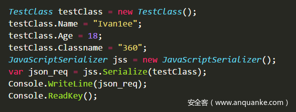 使用JavaScriptSerializer类中的Serialize方法非常方便的实现.NET对象与Json数据之间的转化,笔者定义TestClass对象,常规下使用Serialize得到序列化后的Json