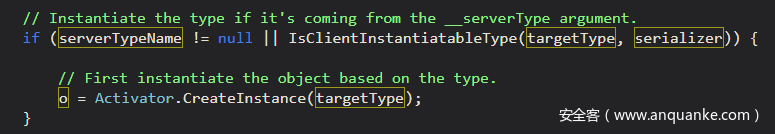 这段代码首先判断ServerTypeFieldName存在值的话就输出赋值给对象s,第二步将对象s强制转换为字符串变量serverTypeName,第三步获取解析器中的实际类型,并且通过System.Activator的CreateInstance构造类型的实例