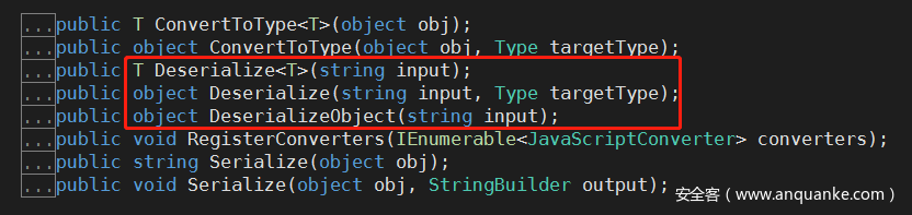 JavaScriptSerializer还有一个反序列化方法DeserializeObject,这个方法同样可以触发漏洞,具体污染代码如下