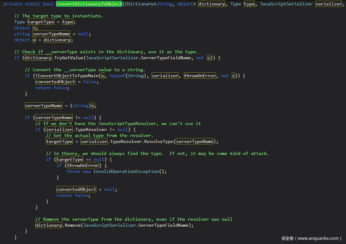 剥茧抽丝,忽略掉非核心方法块ConvertObjectToType、ConvertObjectToTypeMain 、ConvertObjectToTypeInternal,最后定位到ConvertDictionaryToObject方法内