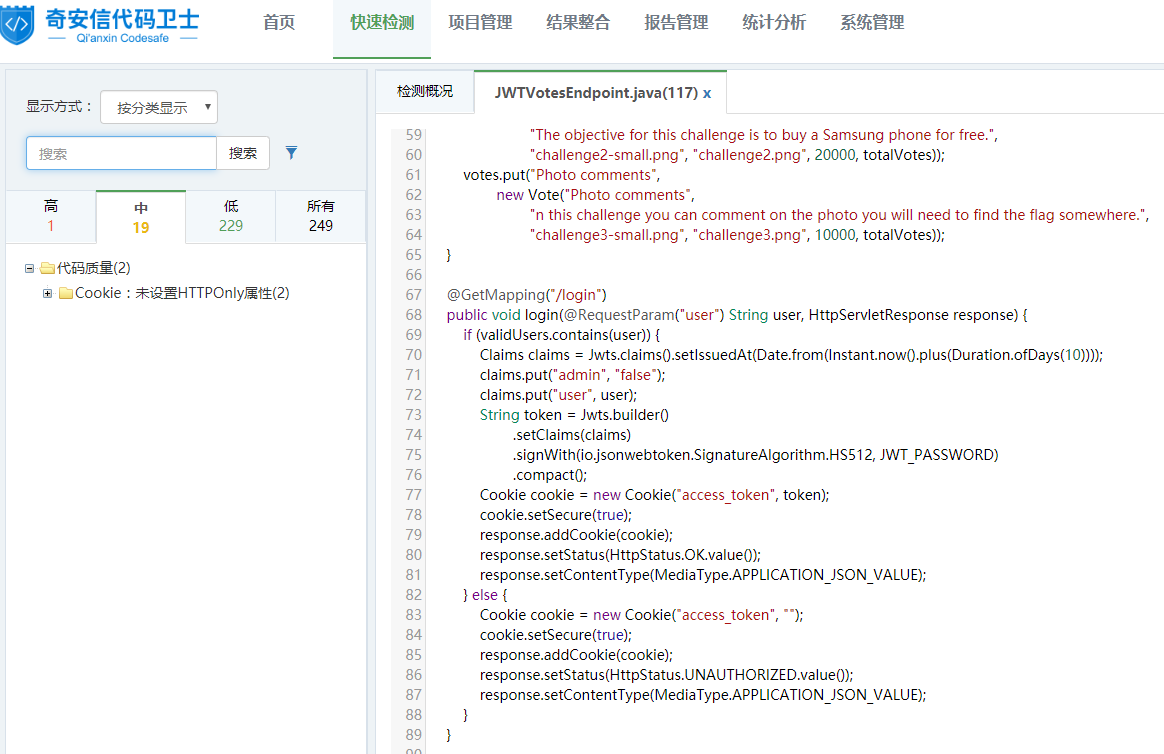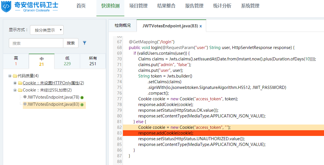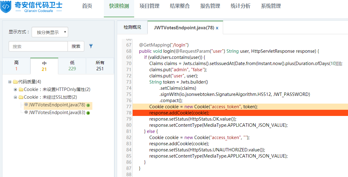 使用代码卫士对上述示例代码进行检测,可以检出“Cookie:未经过SSL加密”缺陷,显示等级为中。在代码行第78行和第83行报出缺陷如图1、图2所示: