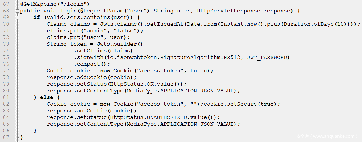 上述示例代码是判断登录用户是否为指定用户,如果是指定用户,生成一个加密的Token 作为 Cookie 的值。在代码行第69行判断用户是否为指定用户: 如果是,在第70~72行声明了一个指定签发时间的自定义属性claims,并在 claims 中设置属性,user 的属性值为变量 user,admin 属性值为 false。第73行~76行JWT使用 SHA-512HMAC 算法生成一个 Token,并赋值给 token。第77行创建一个名称为access_token,值为 token 的 Cookie 对象。第78行将该 Cookie 对象放入response 中。如果不是指定用户,则创建一个名称为 access_token,值为空字符串的 Cookie 对象。如果应用程序同时使用 HTTPS 和 HTTP,但没有设置 secure 标记,那么在 HTTPS 请求过程中发送的 Cookie 也会在随后的 HTTP 请求过程中被发送。通过未加密的连接网络传输敏感信息可能会危及应用程序安全。