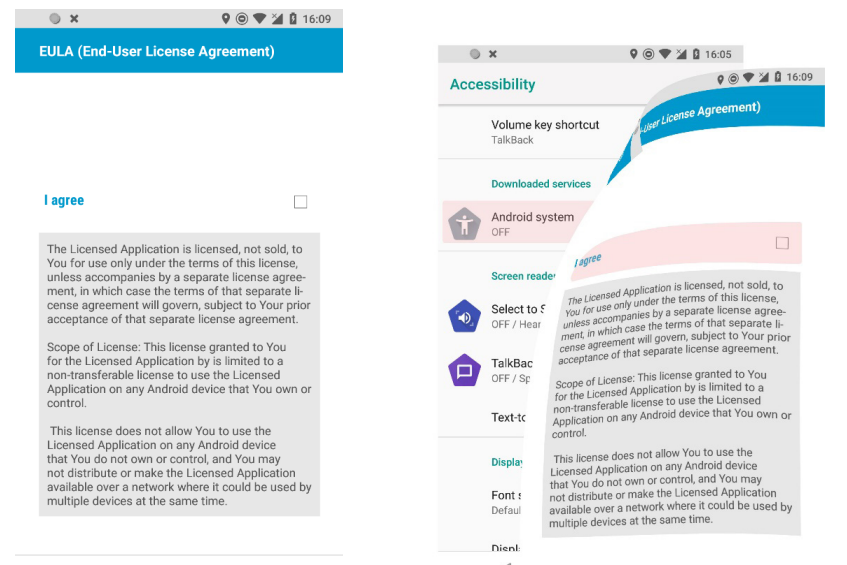 首先他构造了手机设备上可访问性服务列表初始视图,将“Iagree”复选框定位于自身开启可访问性服务的开关,当用户点击“Iagree” 它们将按下与自身对应的可访问性条目。