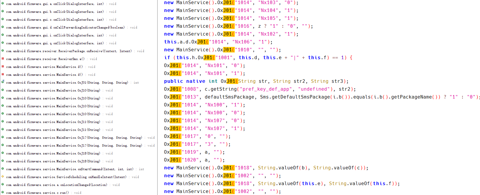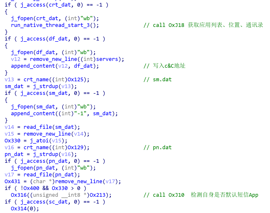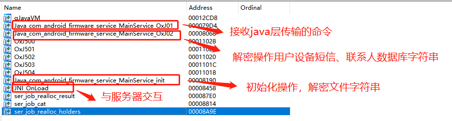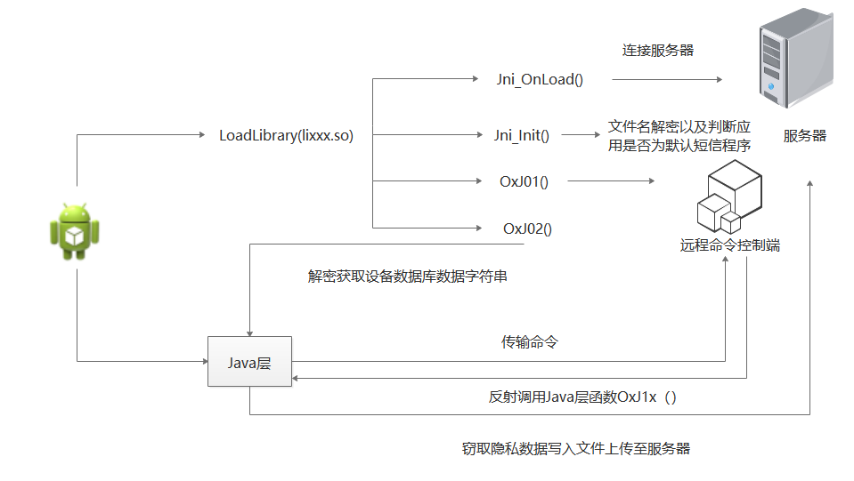 字符串动态解密、客户端与服务器交互、远程命令控制等重要函数放在native层。