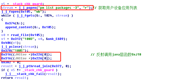 执行cmd命令获取用户设备应用列表并通过反射调用java层0xJ18函数执行窃取用户设备账户信息、以及联系人信息操作。