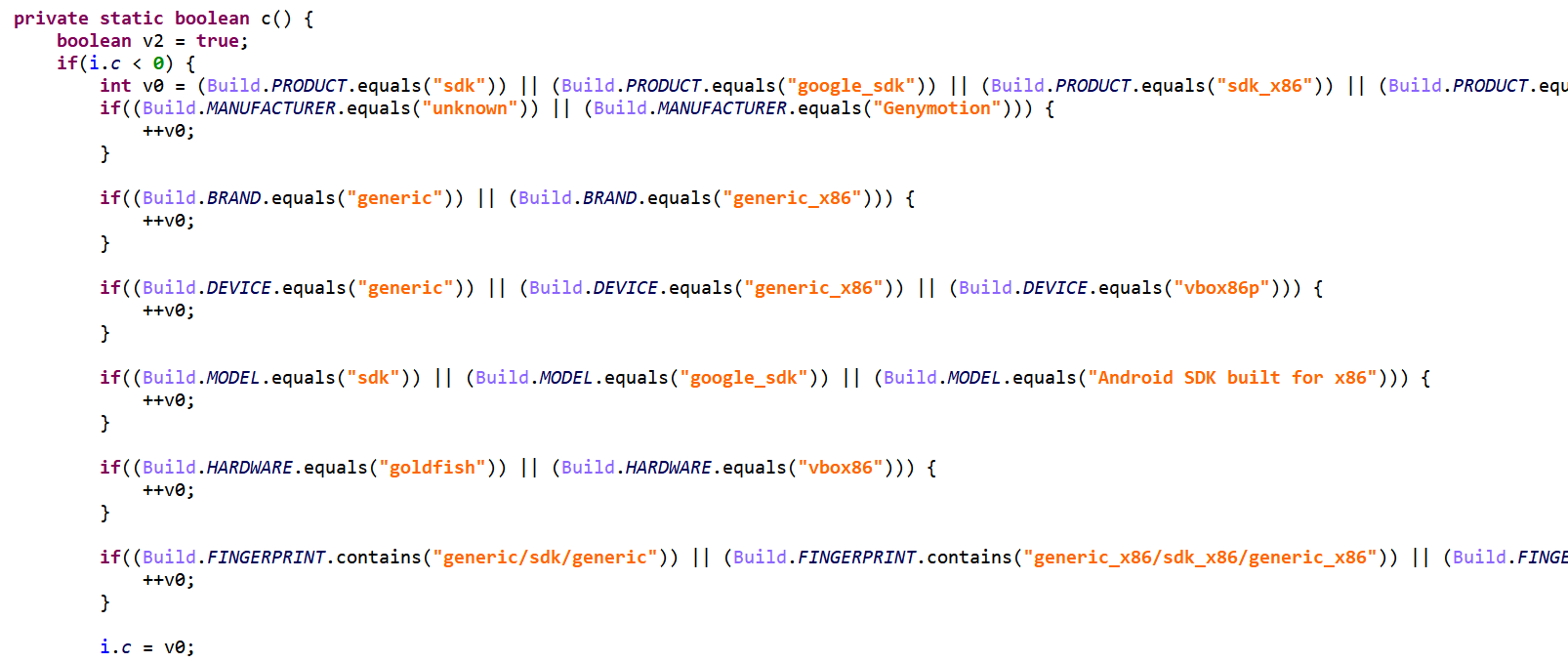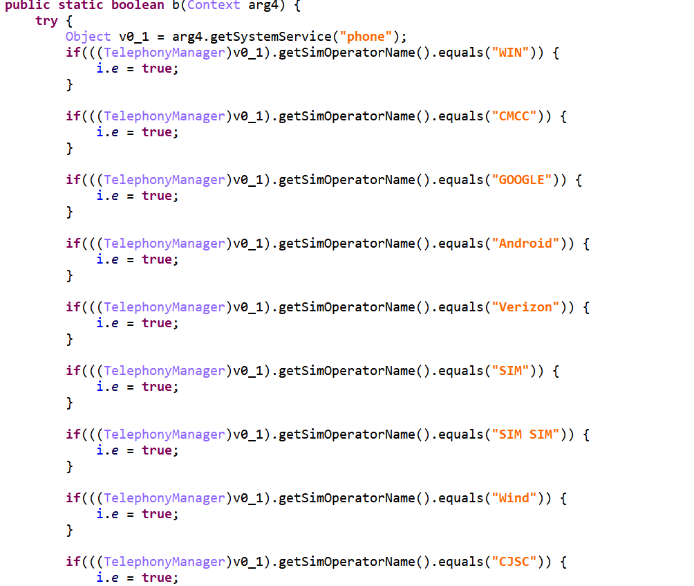 应用启动后便会检测用户设备SIM卡运营商以及国家码ISO,如果满足某些条件,恶意软件将停止运行:它避免在低收入国家、非洲国家、前苏联国家或以阿拉伯语为主的国家运行。它还避免了在没有SIM卡的设备上或在特定运营商发布的SIM上运行。其中排除在SIM卡运营商为“CMCC”(中国移动通信集团公司)的设备上运行。
