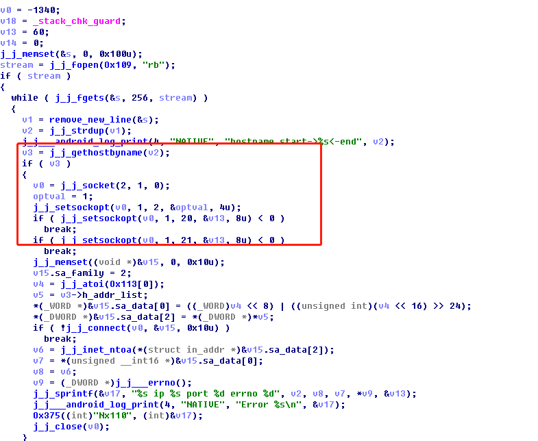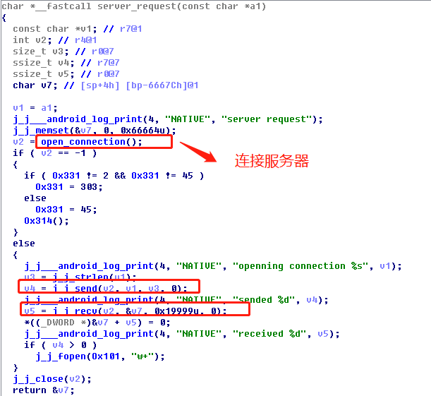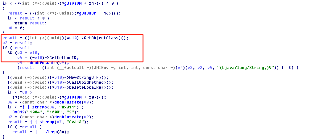 通过设备检测后,应用便会调用native层init()函数进行一些字符串解密以及隐私数据收集操作,但在这之前应用会在首次加载的JNI_OnLoad函数中进行一些初始化操作并连接服务器与服务器进行交互。