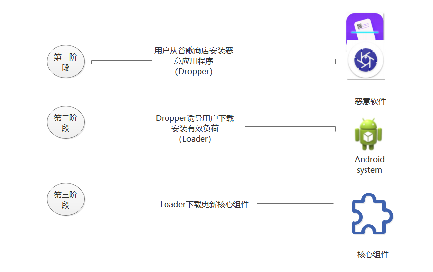 整个恶意程序执行流程分为三个阶段:用户从google商店下载伪装成正常应用的恶意软件。恶意软件被安装执行后在后台下载有效负荷(伪装成androidsystem)诱导用户安装使用,最后在有效负荷中下载更新核心组件。
