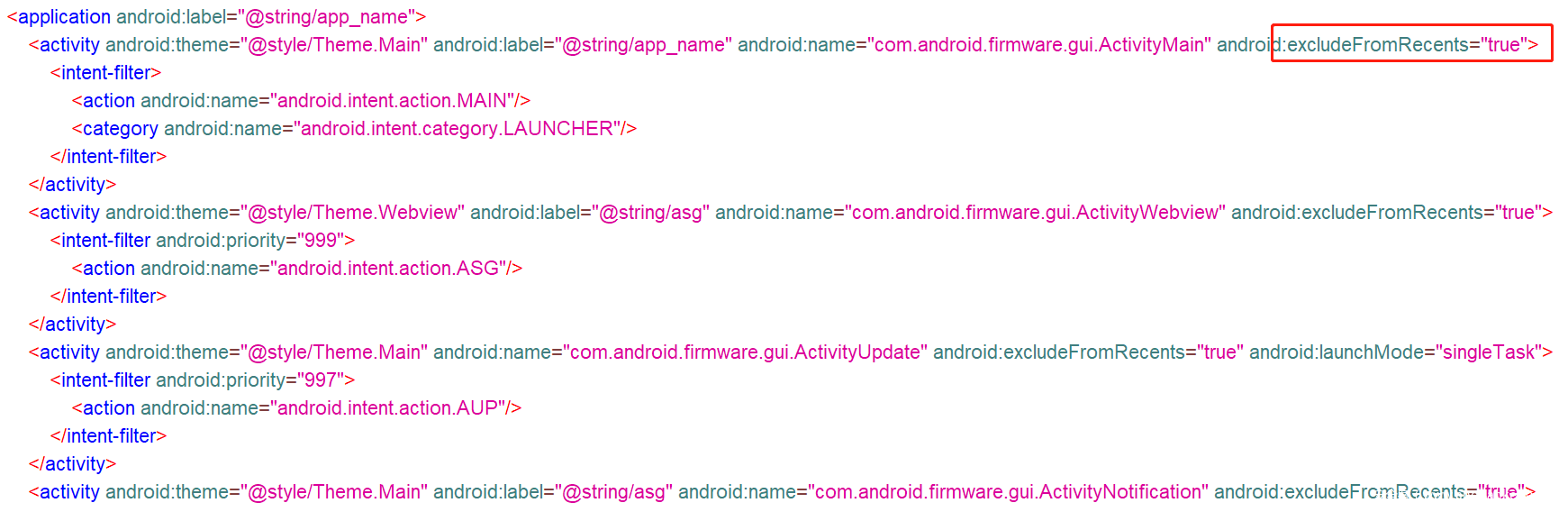 (1)在清单文件中将Activity组件设置为不在最近任务中出现。