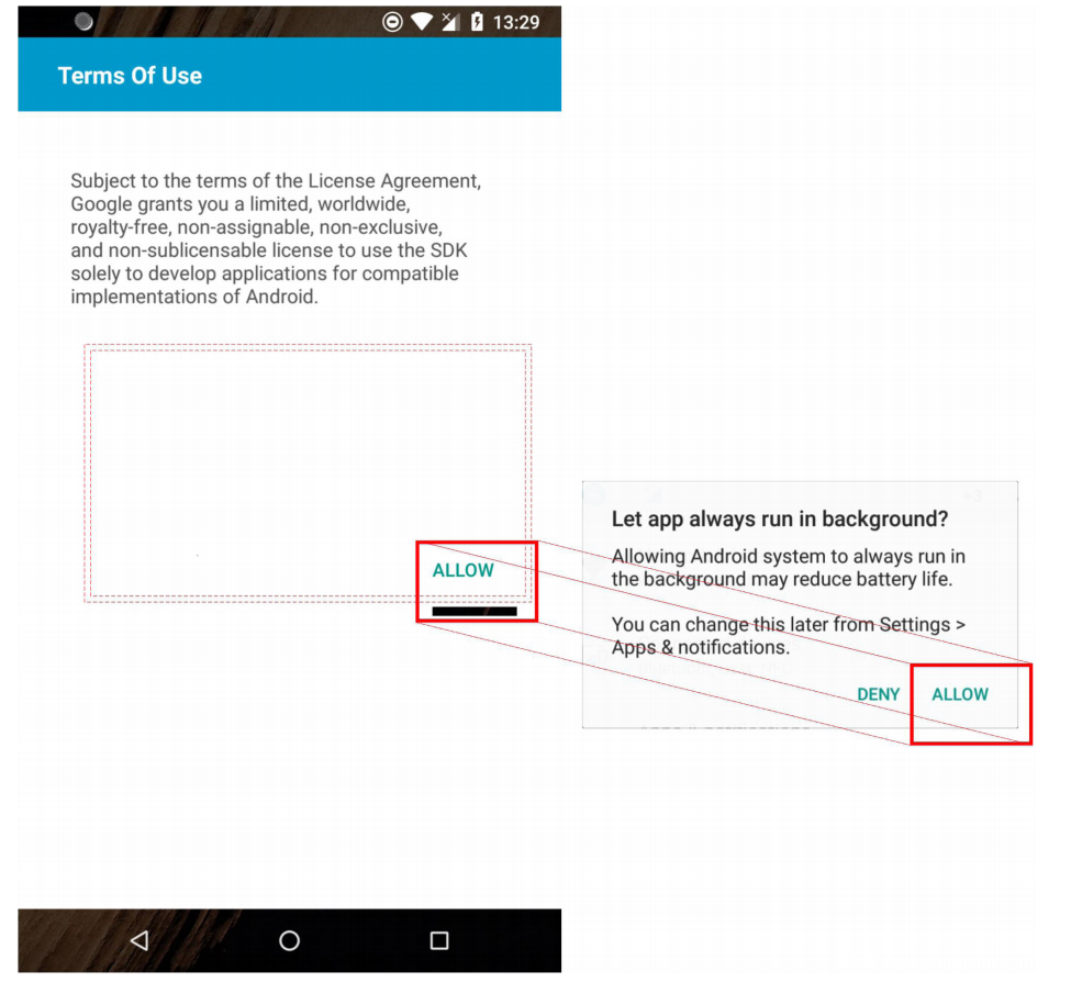 该应用构建的视图中“allow”按钮正对应着授予忽略电池优化权限的按钮。当用户按下“allow”按钮便授予了该权限。