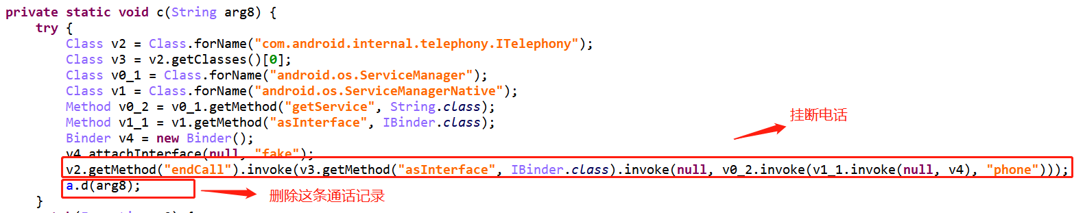 监听用户电话状态,降低音量并阻止来电。将来电号码进行对比后执行挂断电话、删除通话记录或录音操作。