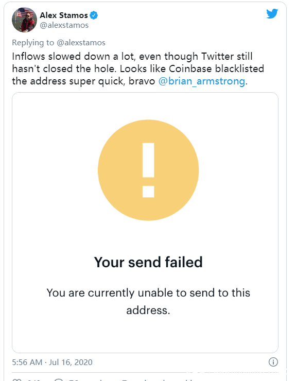 通过这样做,Coinbase阻止了大约1000个用户被骗,从而阻止了他们向Twitter黑客的钱包发送了30.4个比特币。
