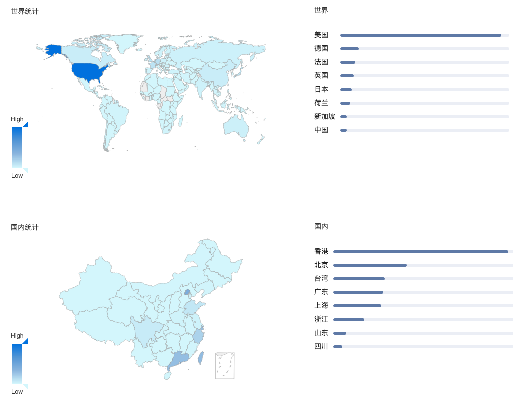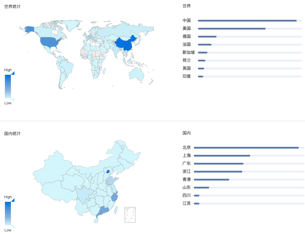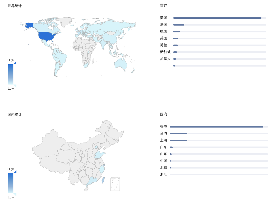 目前 WordPress 在全球均有分布,具体分布如下图,数据来自于 360 QUAKE