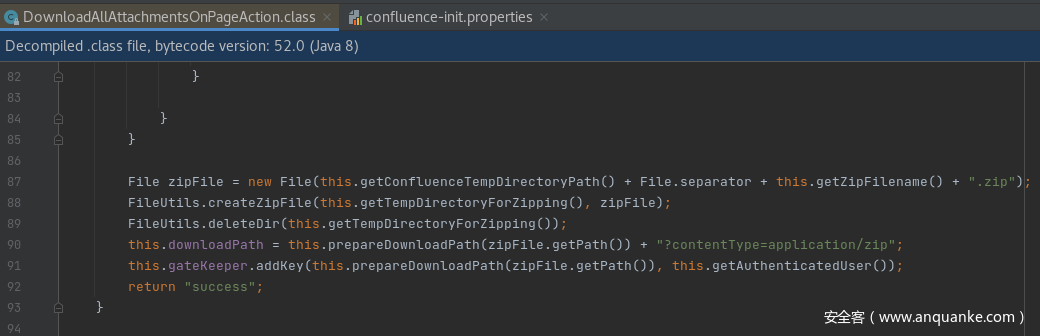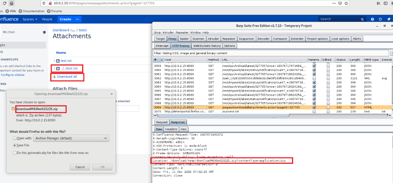该zip文件的上两级目录中存在 test.txt 文件。该 download all 的处理功能代码位于 confluence 安装目录下的 confluence/WEB-INF/lib/confluence-6.15.1.jar/com/atlassian/confluence/pages/DownloadLAllAttachmentsOnPageAction.class 文件中。