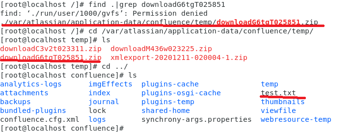 可知前面下载全部附件时zip的文件名结构和存放位置。copy时,缓存流中的附件 ../../test.txt 就存放在/confluencehome/temp/downloadG6tgT025851/ 下。