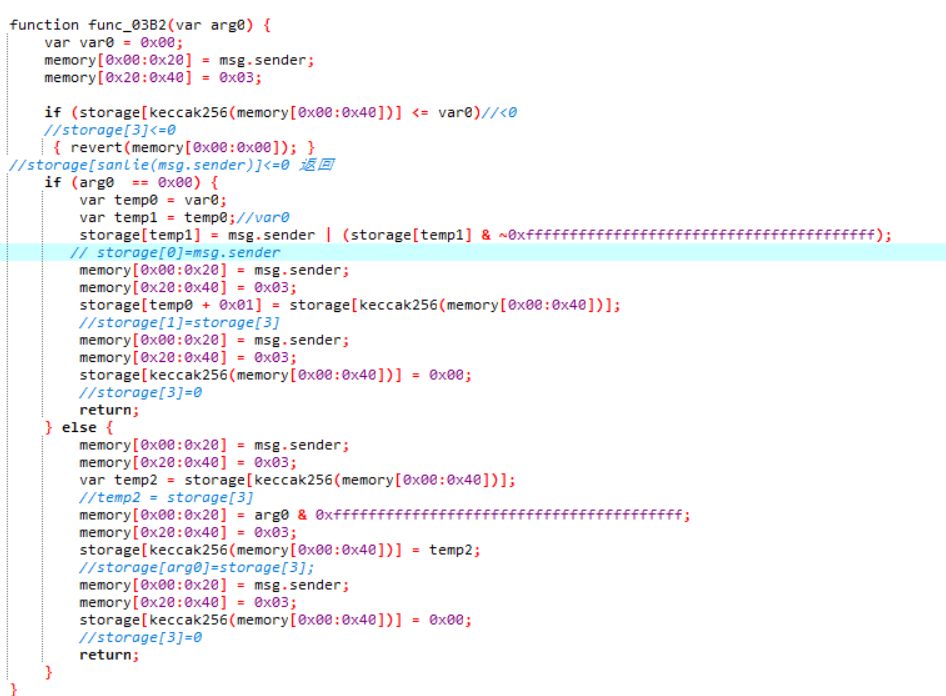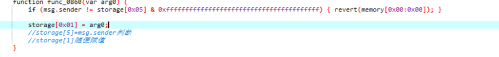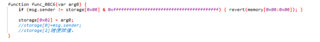 //msg.sender == storage[2] 那么 storage[3]=arg0;