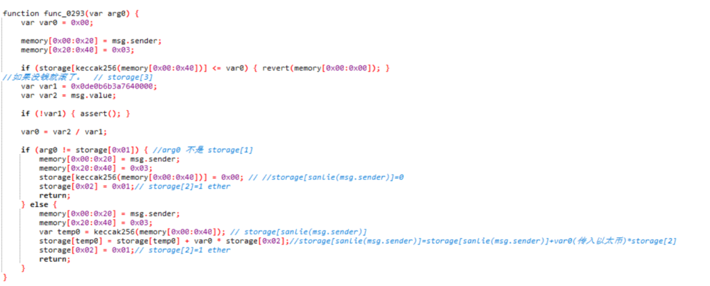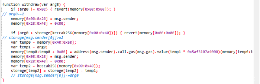 withdraw () 这里限制了 storage[msg.sender[0]]>=2 然后他进行了 msg.call() 这里可以进行重入。 然后看下面, storage[msg.sender[0]]-=2 , 那么自然而然想到了payforflag()的条件。 所以我们可以想到使用这里来实现重入下溢, 从而得到payforflag()的条件。
