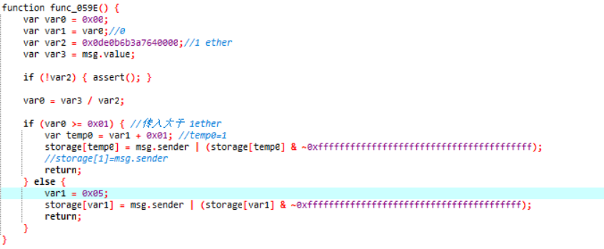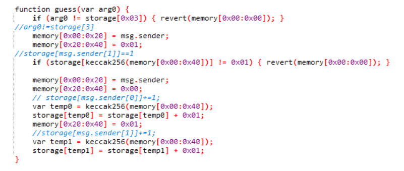 利用guess 猜数字,如果和storage[3]相等,且storage[msg.sender[1]]==1 的时候, storage[msg.sender[0]]+=1,storage[msg.sender[1]]+=1.