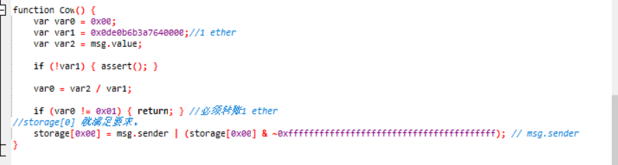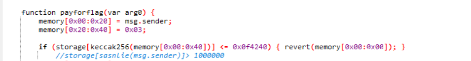 我们从而得知payforflag()条件就是 storage[msg.sender[0]]>10000000000