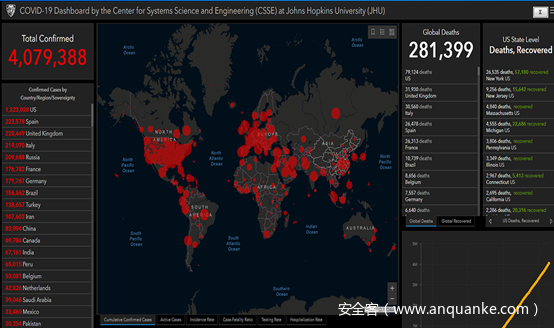 在样本运行后,会显示一个伪造的 COVID-19 疫情情况信息图表,来自 the Center for Systems Science and Engineering at Johns Hopkins University 。